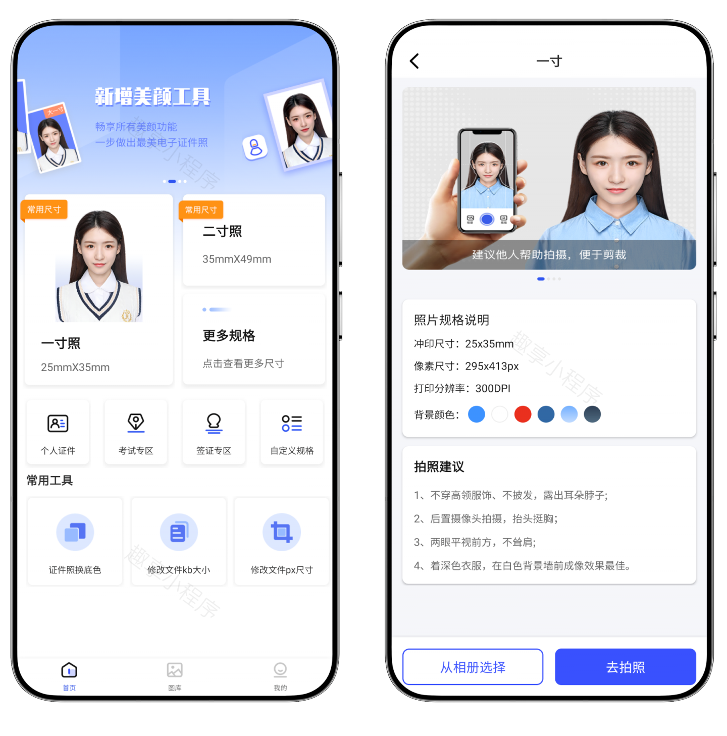 现在这类软件的需求量非常高,正因为它方便快捷。对于学生而言,他们可以在家中通过软件轻松拍摄并编辑出符合学校要求的证件照,省去了前往照相馆的麻烦。对于职场人士来说,软件提供了多种职业装模板,让他们能够轻松打造出专业、得体的形象。同时,对于需要办理签证或护照的用户来说,软件也提供了符合国际标准的证件照尺寸和背景色选择,满足了他们的特殊需求,所以下面就给大伙安利一款。进入软件既是VIP会员,而且是不需要登录任何账号的,在软件首页默认展示有一尺、二寸规格,需要更多尺寸可以点击”更多规格“进入,还有证件、考试、签证、自定义规格,在下方还有证件照换底色、修改文件大小和修改文件尺寸的工具。