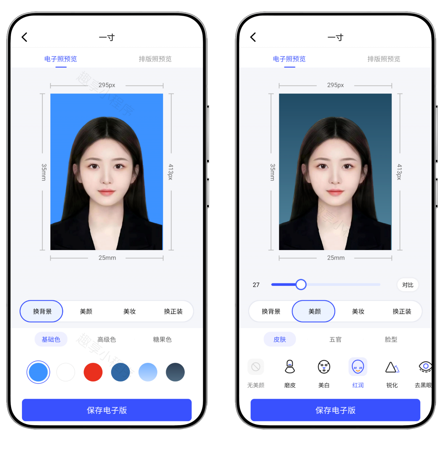 如下图,生成后再编辑页面分别有换背景、美颜、美妆、换正装四大功能,如下图可以切换不同的背景底色