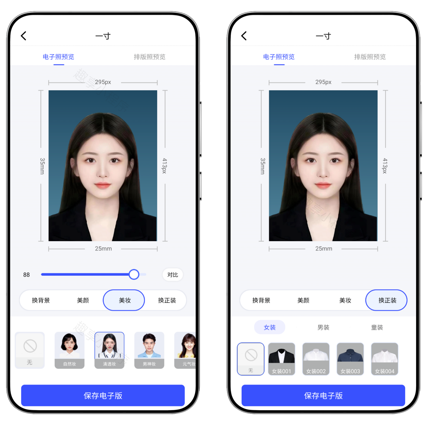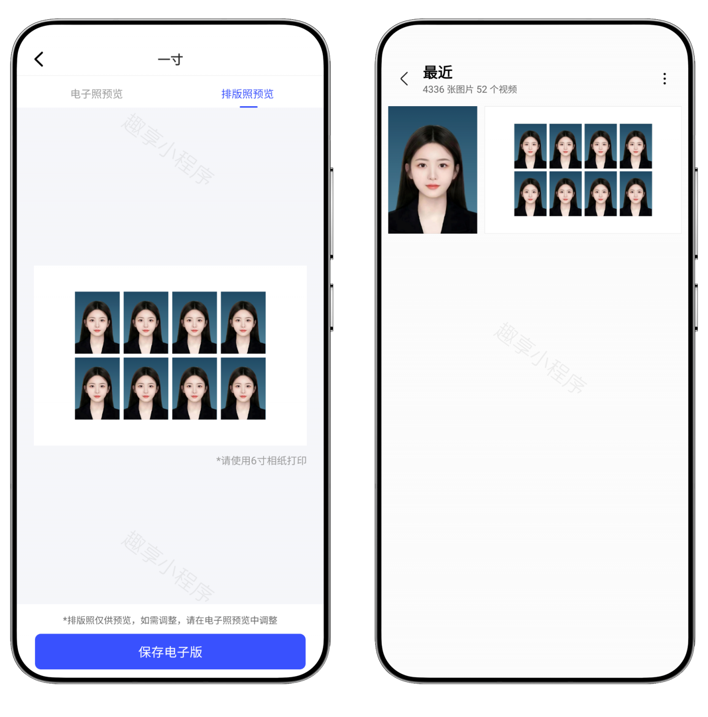 点击“保存电子版”可一键保存到手机中,支持同时保存单张和一张6寸打印照,而且保存下面的画质均为不压缩的高清原图。