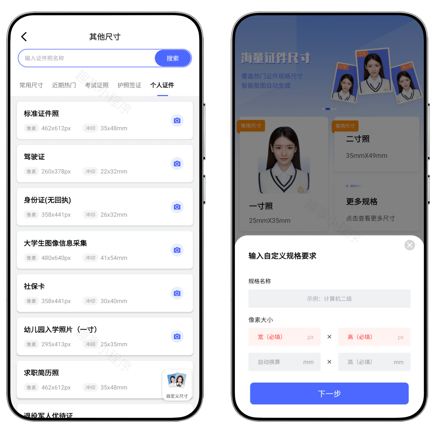 进入“更多规格”专区还有常用、热门、考试、护照和个人等分类数百种常用证件照尺寸可选,还可以自定义证件照的尺寸。
