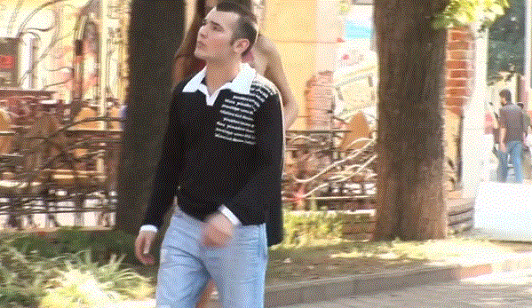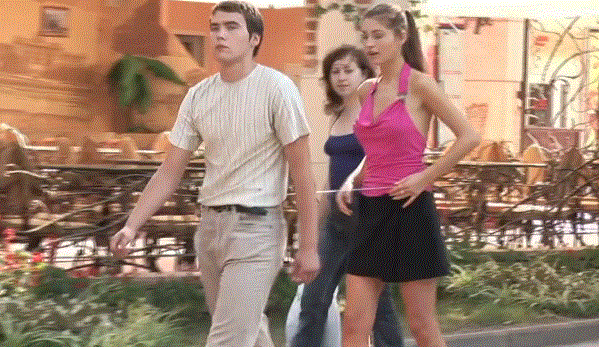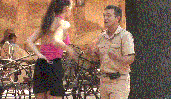 再看第二个美女,专门将裙子勾住路人的裤带制造意外,还打人哎: